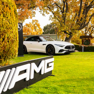 El punto de encuentro fue el Golf de la Herrería, junto al Escorial, donde nos esperaba un ambiente totalmente impregnado del espíritu navideño. El desayuno congregó a todos los asistentes en un entorno impecable y muy cuidado, con una destacada presencia de Mercedes-Benz AMG —nuestro main sponsor— que expuso varios de sus modelos y aportó un toque aún más especial a la mañana.